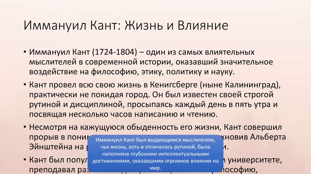 Иммануил Кант: Жизнь и Влияние• Иммануил Кант (1724-1804) – один из самых влиятельных