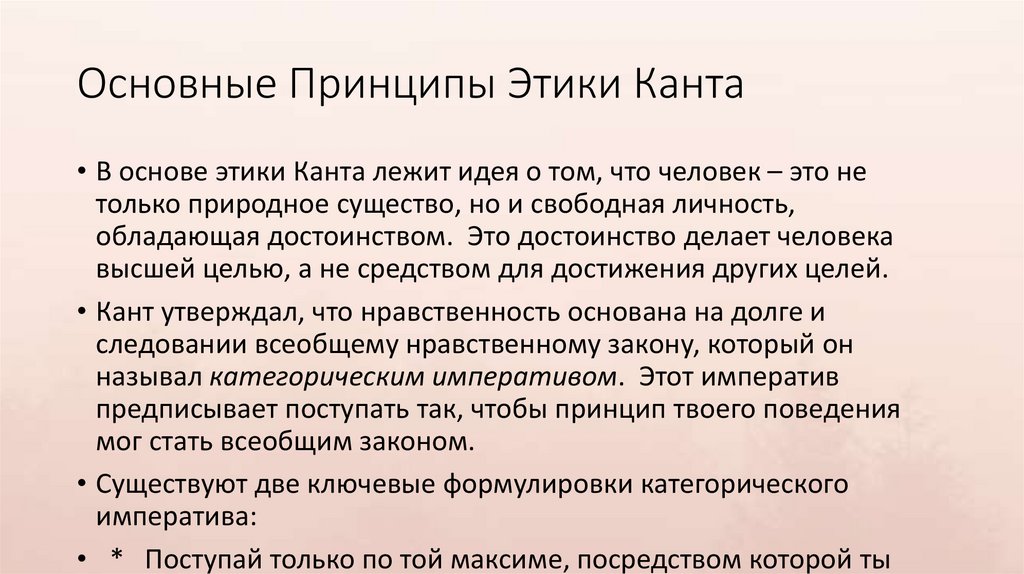 Основные Принципы Этики Канта• В основе этики Канта лежит идея о том, что человек – это не