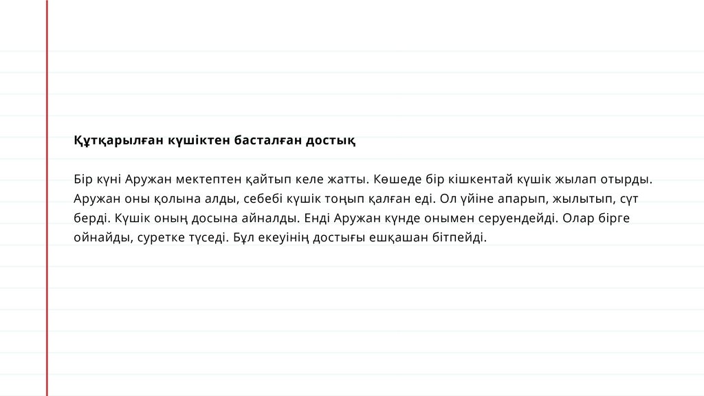Құтқарылған күшіктен басталған достықБір күні Аружан мектептен қайтып келе жатты. Көшеде бір кішкентай күшік жылап отырды.