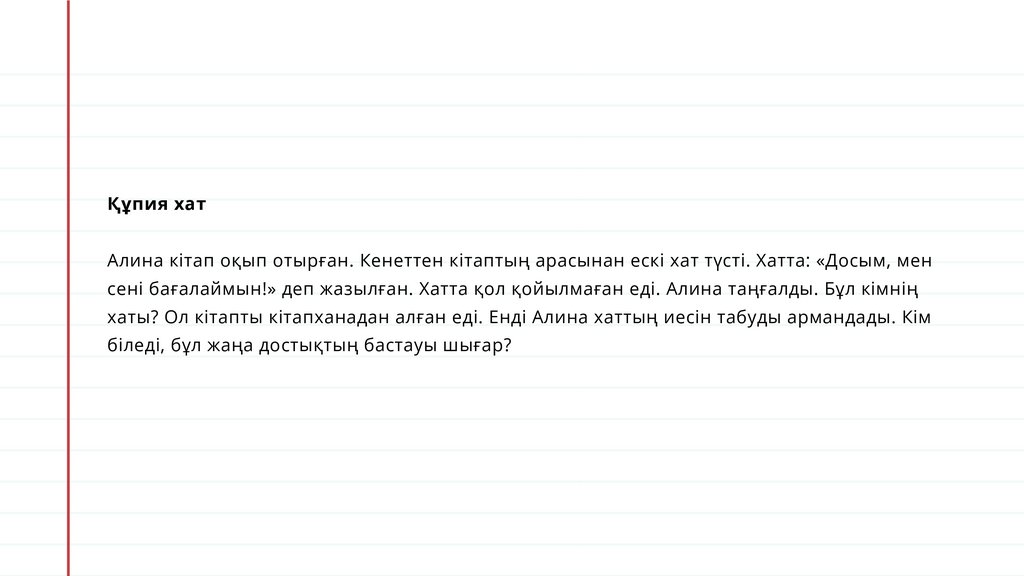 Құпия хатАлина кітап оқып отырған. Кенеттен кітаптың арасынан ескі хат түсті. Хатта: «Досым, мен