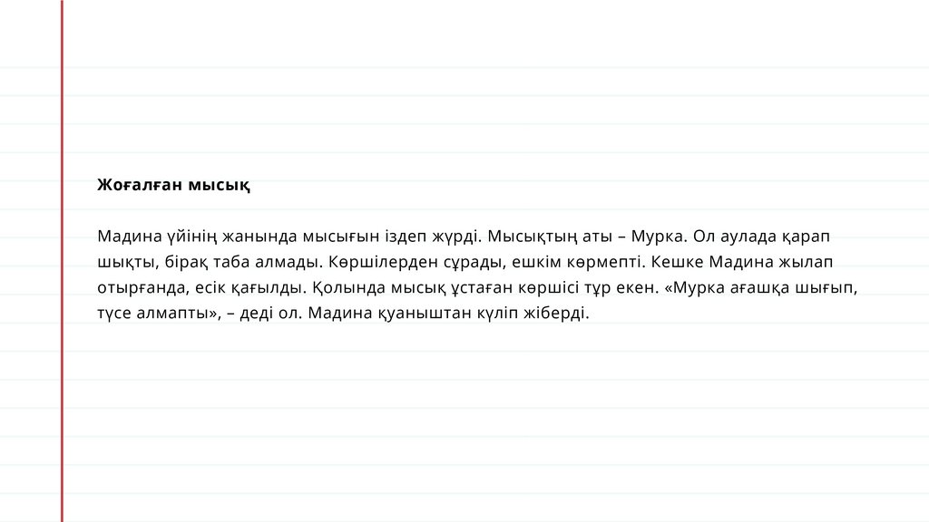 Жоғалған мысықМадина үйінің жанында мысығын іздеп жүрді. Мысықтың аты – Мурка. Ол аулада қарап