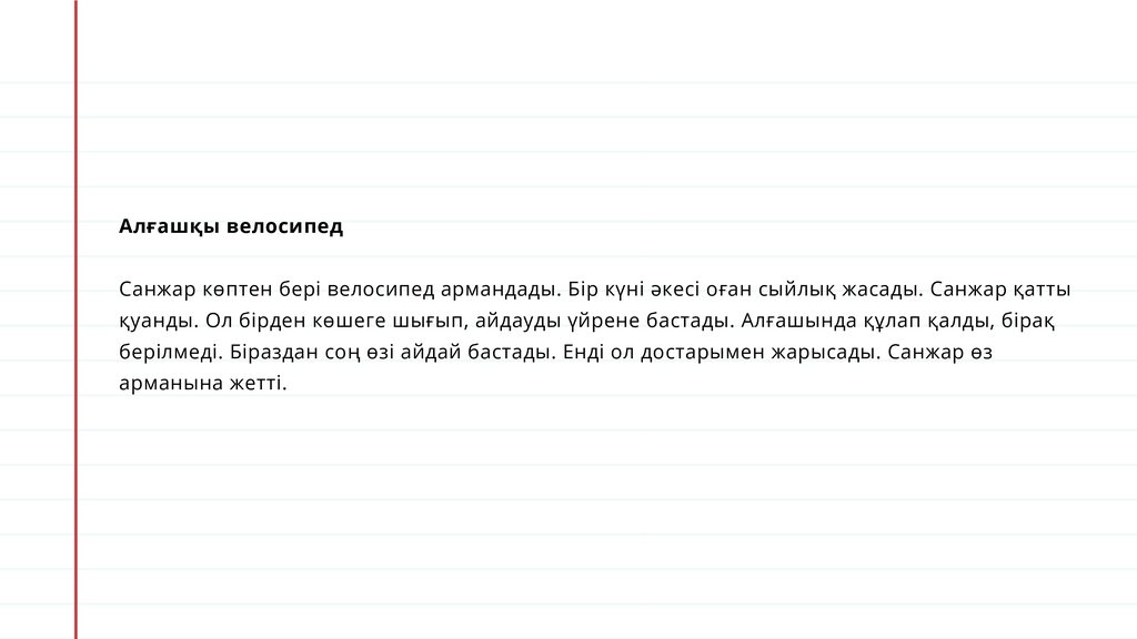 Алғашқы велосипедСанжар көптен бері велосипед армандады. Бір күні әкесі оған сыйлық жасады. Санжар қатты