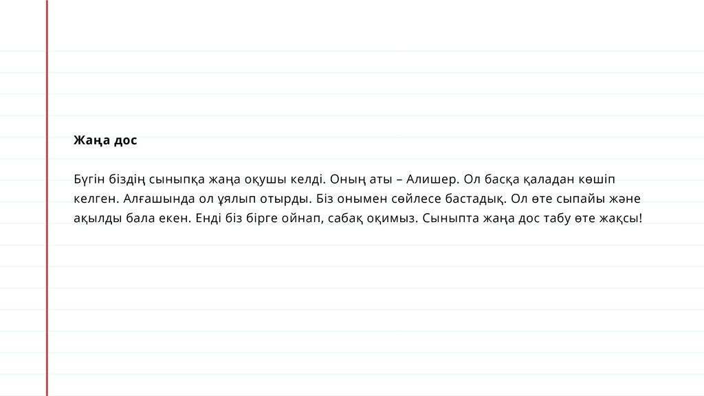 Жаңа досБүгін біздің сыныпқа жаңа оқушы келді. Оның аты – Алишер. Ол басқа қаладан көшіп