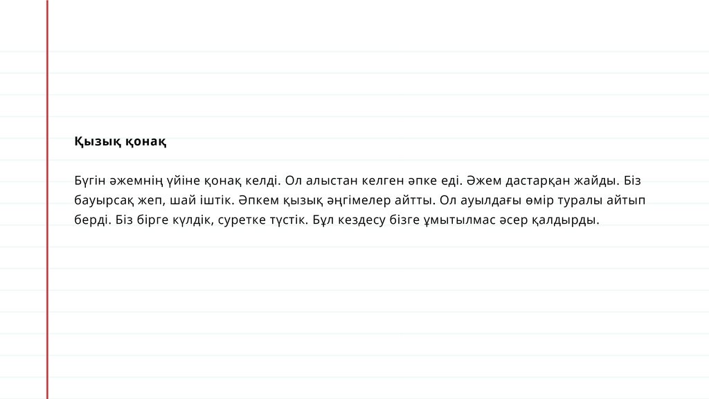 Қызық қонақБүгін әжемнің үйіне қонақ келді. Ол алыстан келген әпке еді. Әжем дастарқан жайды. Біз