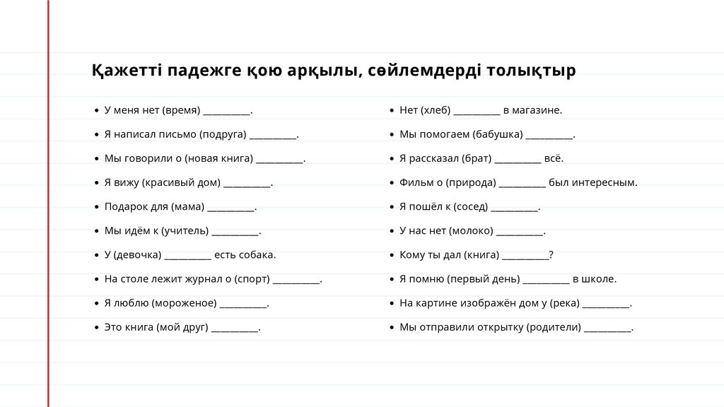 Қажетті падежге қою арқылы, сөйлемдерді толықтыр