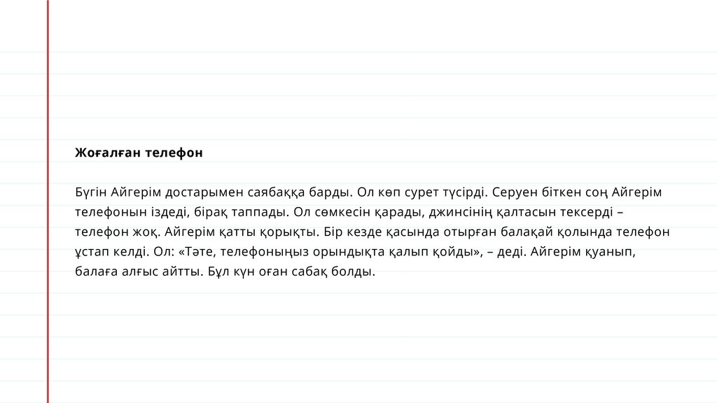 Жоғалған телефонБүгін Айгерім достарымен саябаққа барды. Ол көп сурет түсірді. Серуен біткен соң Айгерім