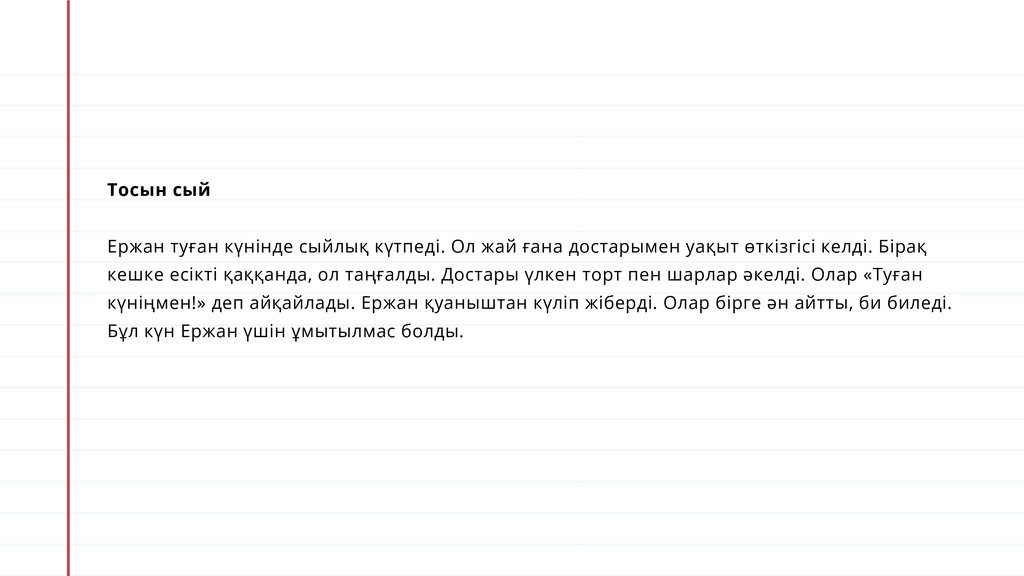 Тосын сыйЕржан туған күнінде сыйлық күтпеді. Ол жай ғана достарымен уақыт өткізгісі келді. Бірақ