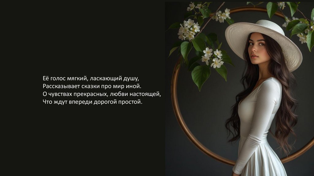 Её голос мягкий, ласкающий душу,Рассказывает сказки про мир иной.