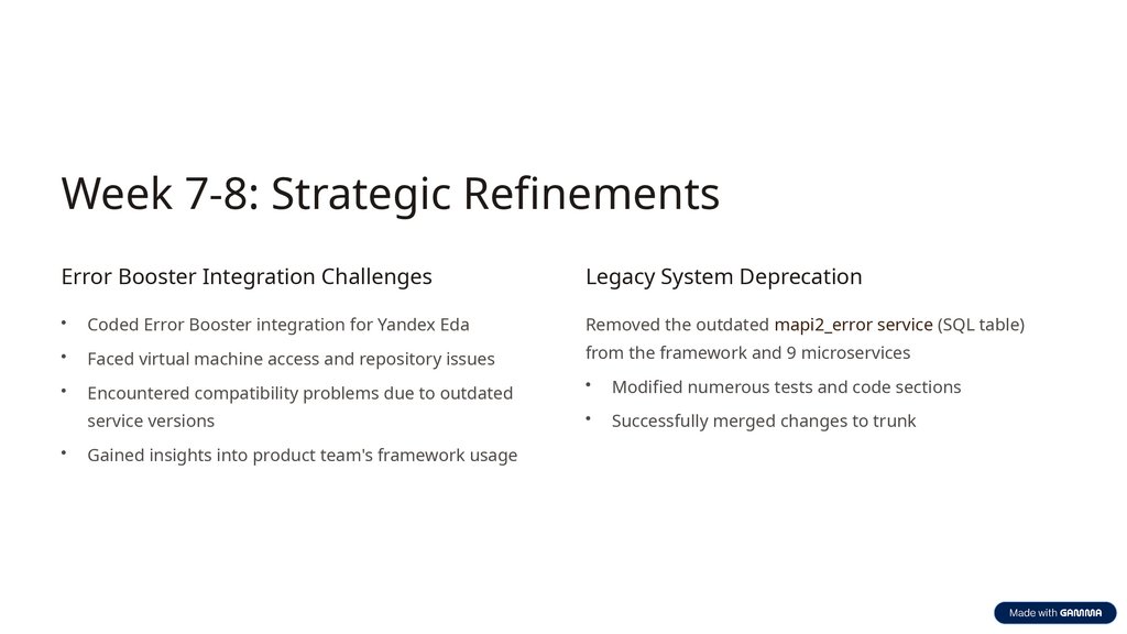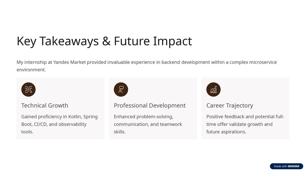 Key Takeaways & Future ImpactMy internship at Yandex Market provided invaluable experience in backend development within a complex microservice