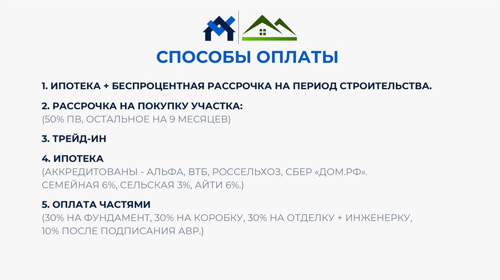 СПОСОБЫ ОПЛАТЫ1. ИПОТЕКА + БЕСПРОЦЕНТНАЯ РАССРОЧКА НА ПЕРИОД СТРОИТЕЛЬСТВА.