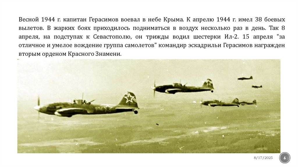 апреля, на подступах к Севастополю, он трижды водил шестерки Ил-2. 15 апреля "за