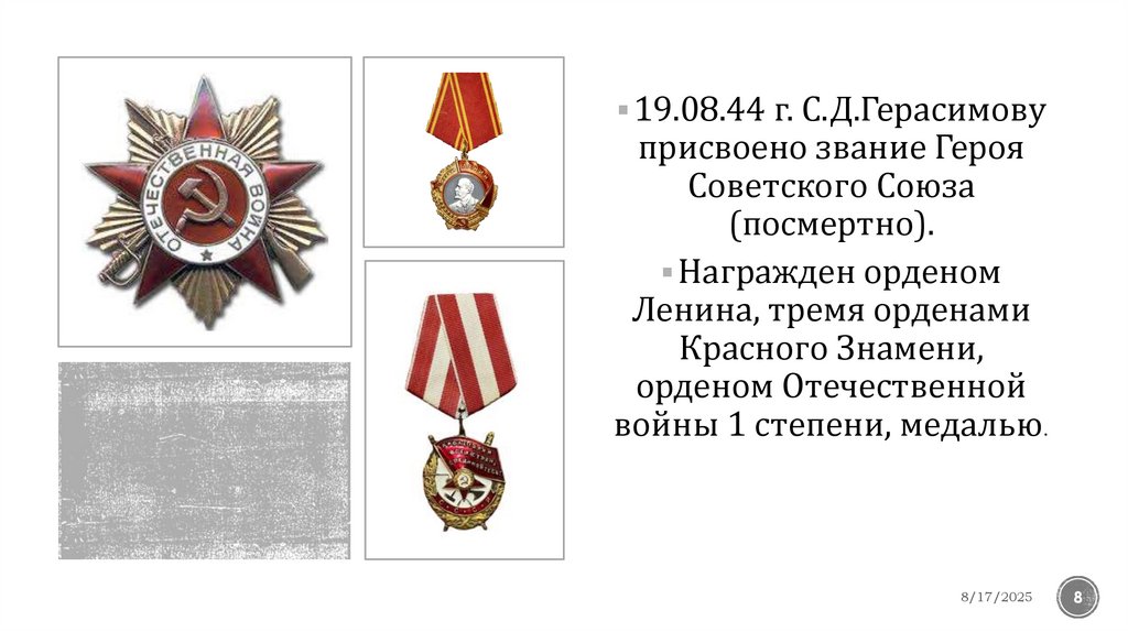 19.08.44 г. С.Д.Герасимовуприсвоено звание Героя