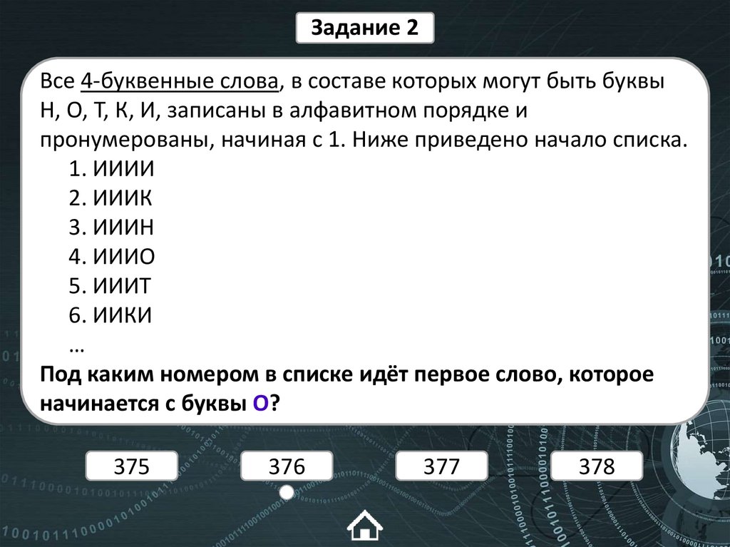 Задание 2Все 4-буквенные слова, в составе которых могут быть буквы