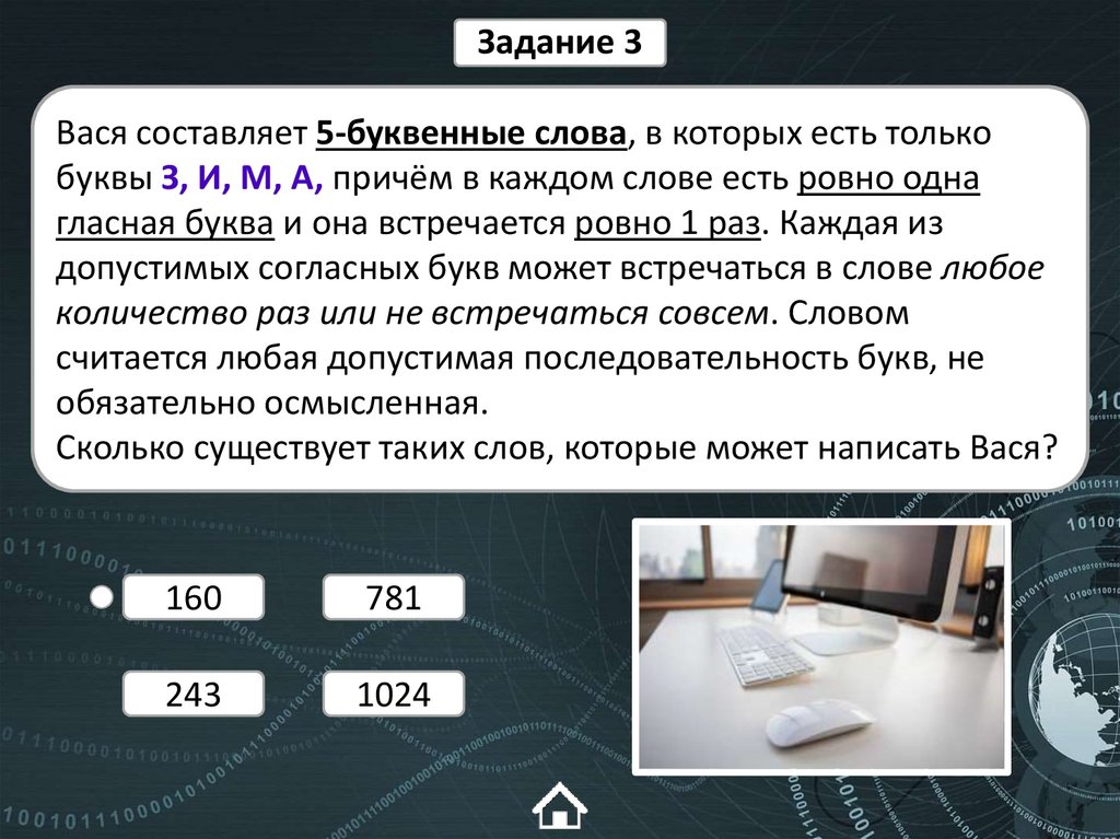 Задание 3Вася составляет 5-буквенные слова, в которых есть только