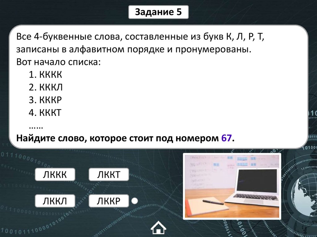 Задание 5Все 4-буквенные слова, составленные из букв К, Л, Р, Т,