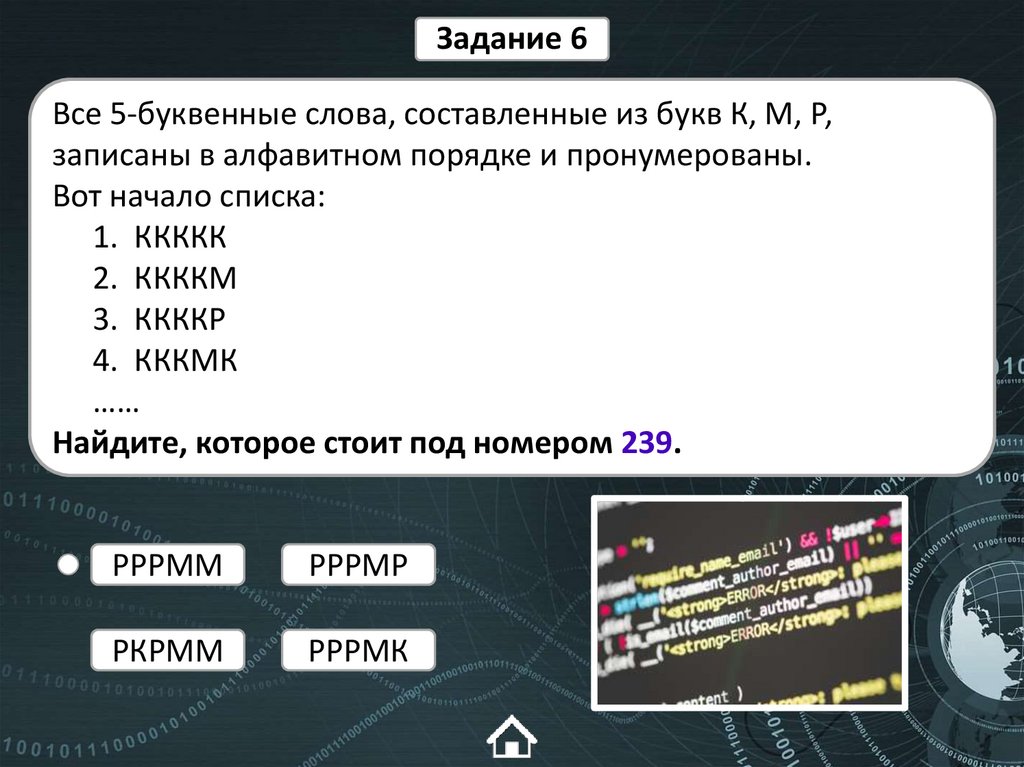 Задание 6Все 5-буквенные слова, составленные из букв К, М, Р,