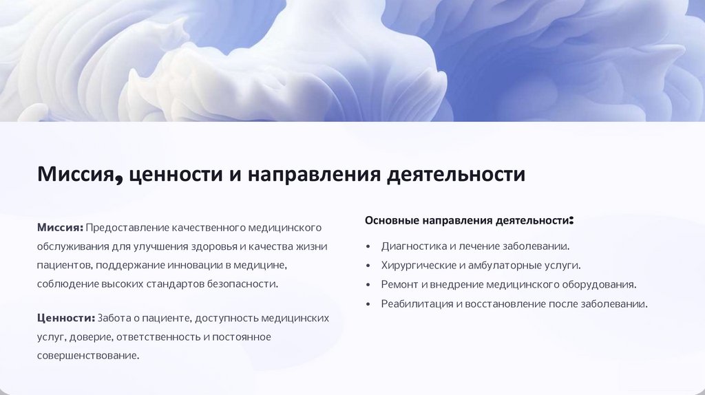 Миссия, ценности и направления деятельностиМиссия: Предоставление качественного медицинского