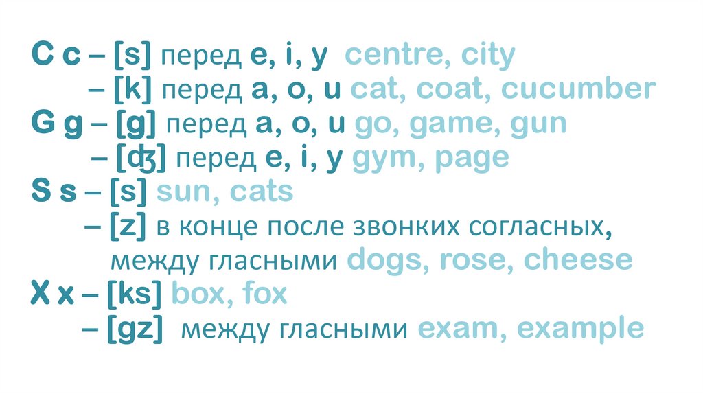C c – [s] перед e, i, y centre, cityC c – [k] перед a, o, u cat, coat, cucumber