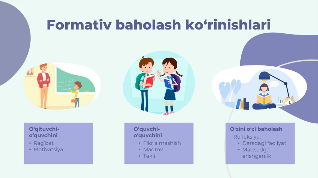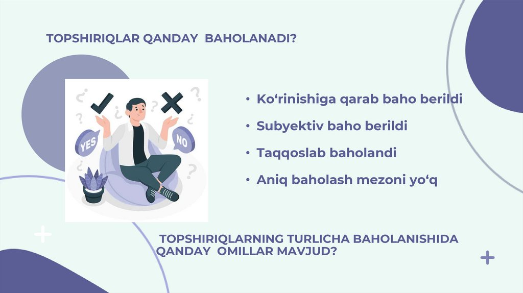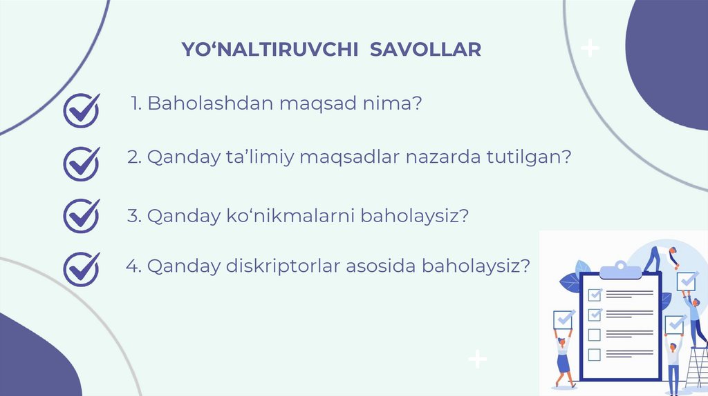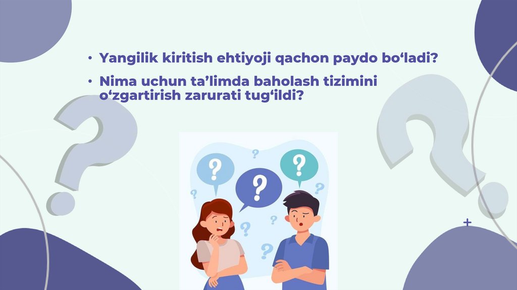 • Yangilik kiritish ehtiyoji qachon paydo bo‘ladi?• Nima uchun ta’limda baholash tizimini