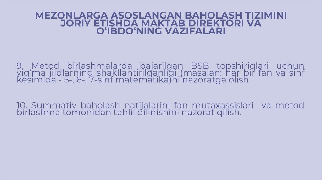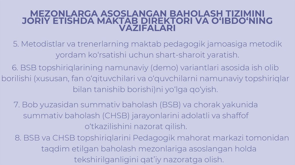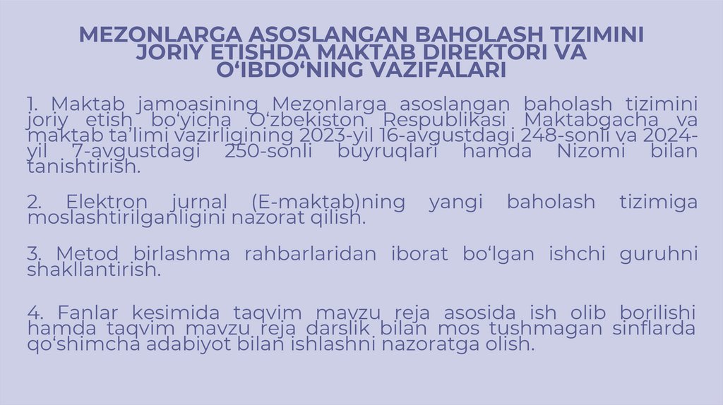 MEZONLARGA ASOSLANGAN BAHOLASH TIZIMINIJORIY ETISHDA MAKTAB DIREKTORI VA