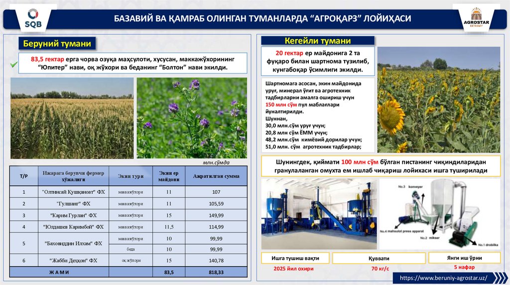 БАЗАВИЙ ВА ҚАМРАБ ОЛИНГАН ТУМАНЛАРДА “АГРОҚАРЗ” ЛОЙИҲАСИКегейли тумани