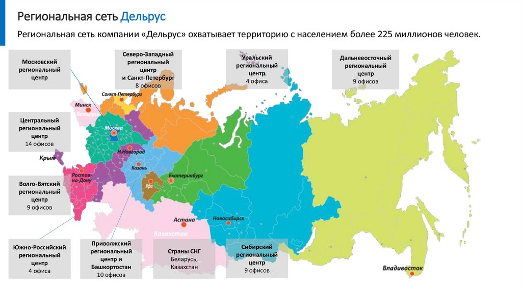 Региональная сеть ДельрусРегиональная сеть компании «Дельрус» охватывает территорию с населением более 225 миллионов человек.