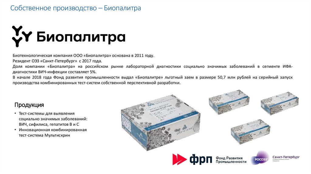 Доля компании «Биопалитра» на российском рынке лабораторной диагностики социально значимых заболеваний в сегменте ИФАдиагностики ВИЧ-инфекции составляет 5%.
