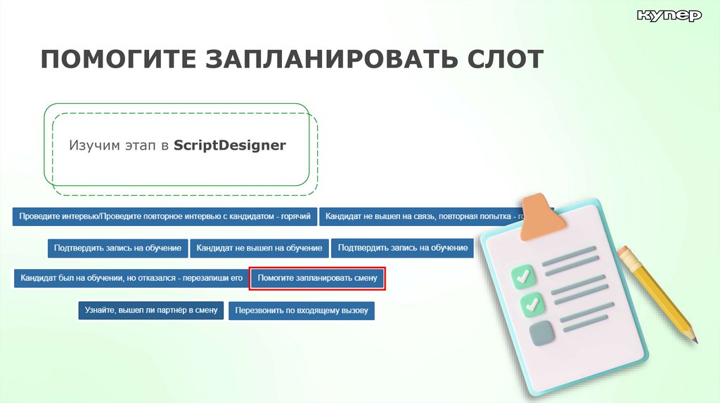 ПОМОГИТЕ ЗАПЛАНИРОВАТЬ СЛОТИзучим этап в ScriptDesigner