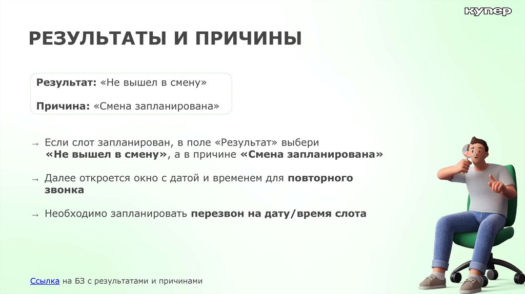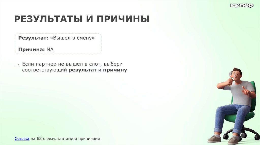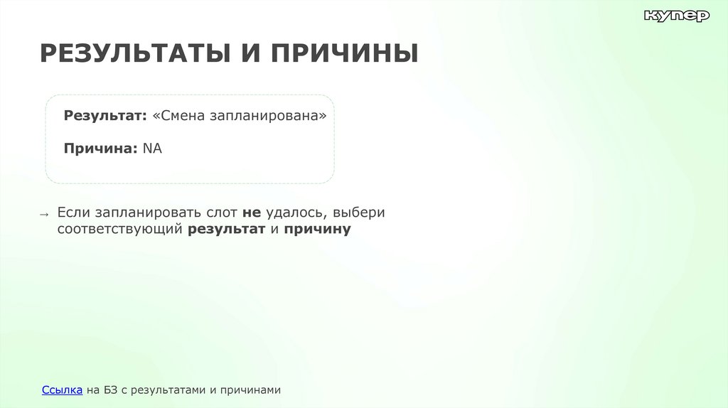 РЕЗУЛЬТАТЫ И ПРИЧИНЫРезультат: «Вышел в смену»