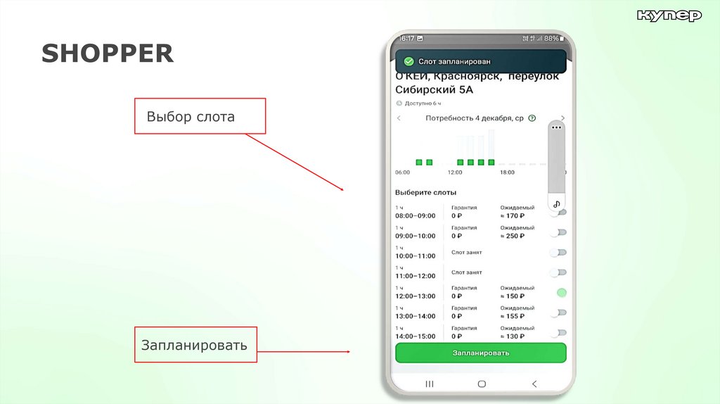 4. Далее выбирать удобные дату и время слота и нажать "Запланировать».