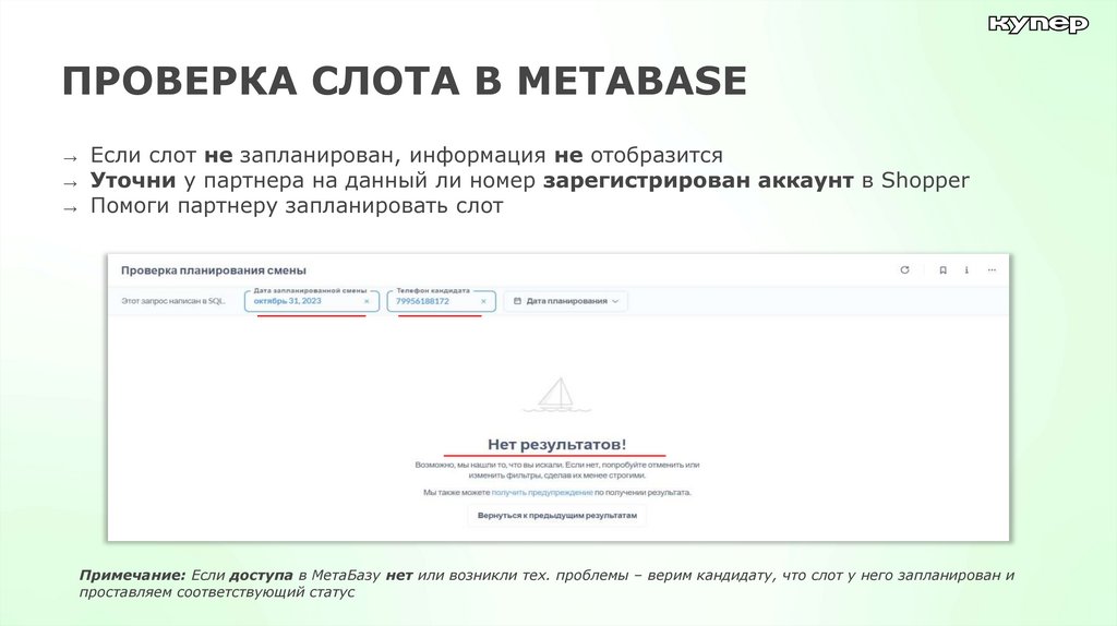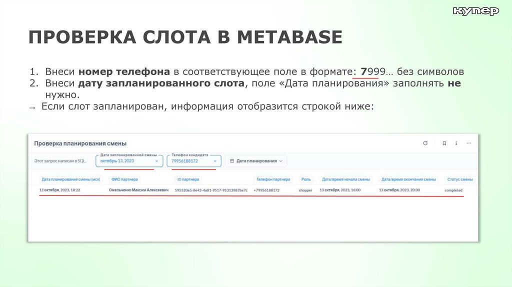 ПРОВЕРКА СЛОТА В METABASE1. Внеси номер телефона в соответствующее поле в формате: 7999… без символов