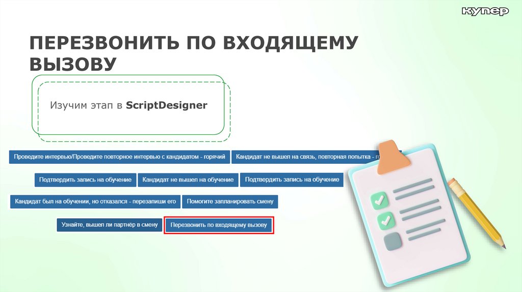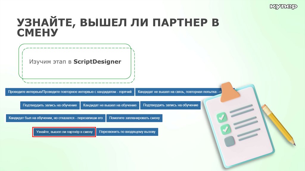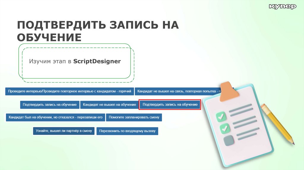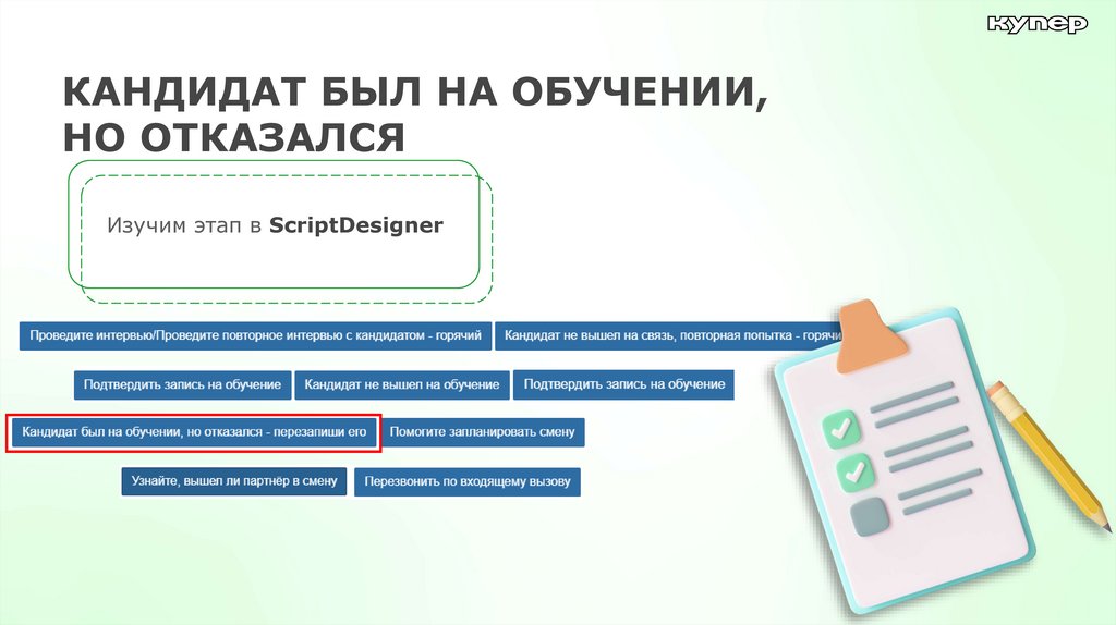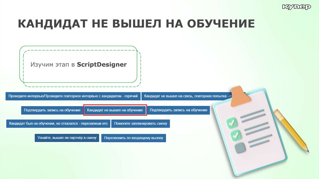 КАНДИДАТ НЕ ВЫШЕЛ НА ОБУЧЕНИЕИзучим этап в ScriptDesigner