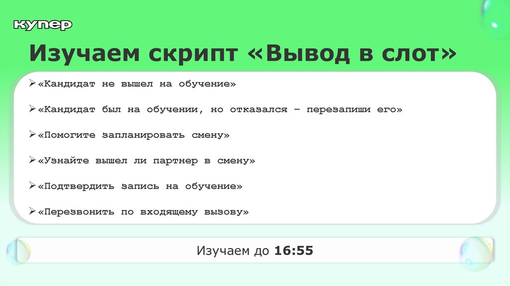 Изучаем скрипт «Вывод в слот»«Кандидат не вышел на обучение»