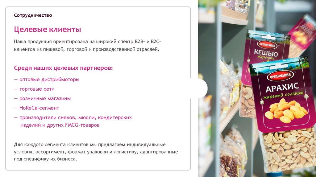 Наша продукция ориентирована на широкий спектр B2B- и B2Cклиентов из пищевой, торговой и производственной отраслей.