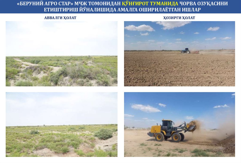 «БЕРУНИЙ АГРО СТАР» МЧЖ ТОМОНИДАН ҚЎНҒИРОТ ТУМАНИДА ЧОРВА ОЗУҚАСИНИЕТИШТИРИШ ЙЎНАЛИШИДА АМАЛГА ОШИРИЛАЁТГАН ИШЛАР