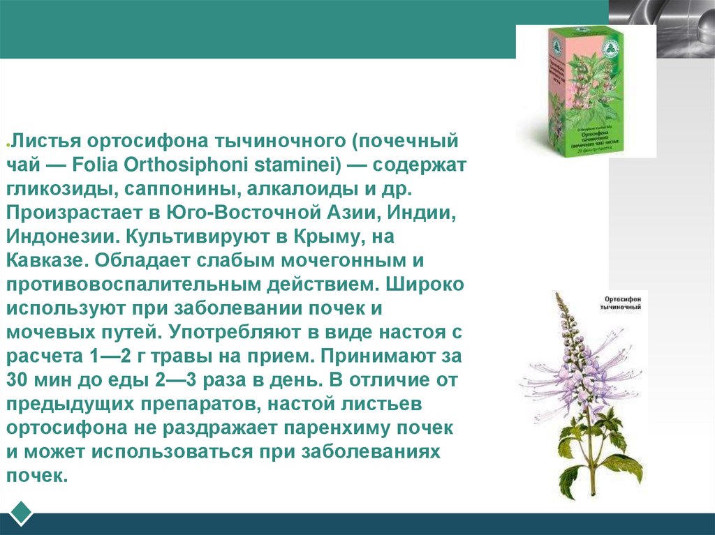 чай — Folia Orthosiphoni staminei) — содержат