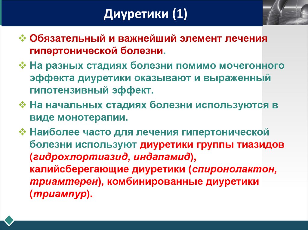 Диуретики (2)При тяжелом течении гипертонической болезни