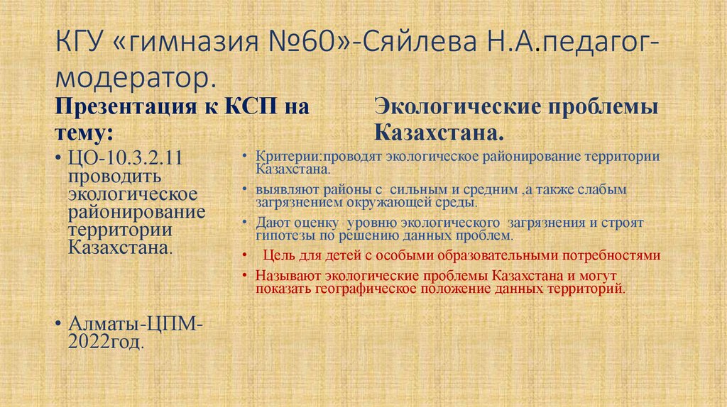 КГУ «гимназия №60»-Сяйлева Н.А.педагогмодератор.Презентация к КСП на