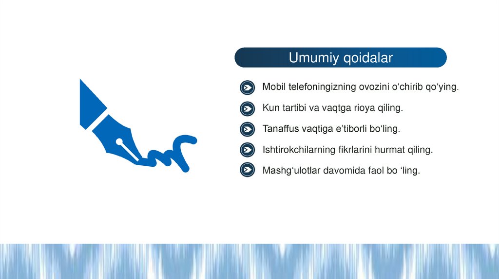 Umumiy qoidalarMobil telefoningizning ovozini o‘chirib qo‘ying.