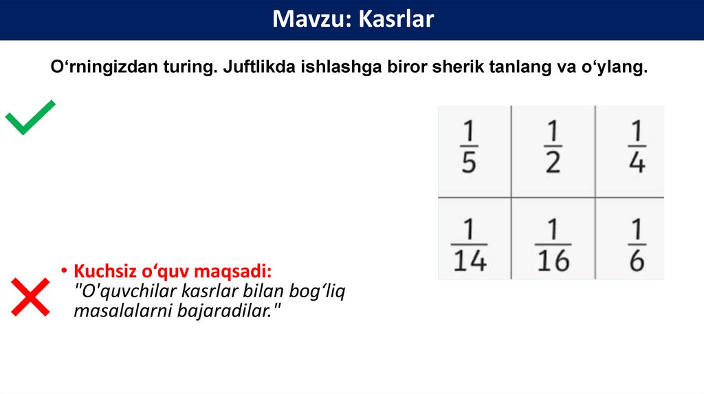 Mavzu: KasrlarO‘rningizdan turing. Juftlikda ishlashga biror sherik tanlang va o‘ylang.