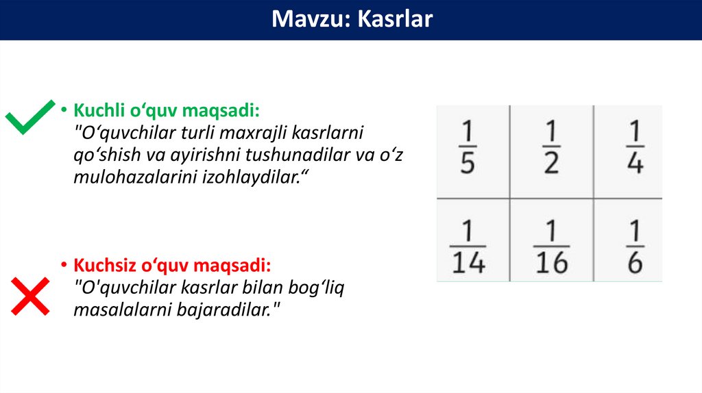 Mavzu: Kasrlar• Kuchli o‘quv maqsadi: