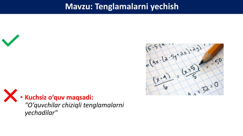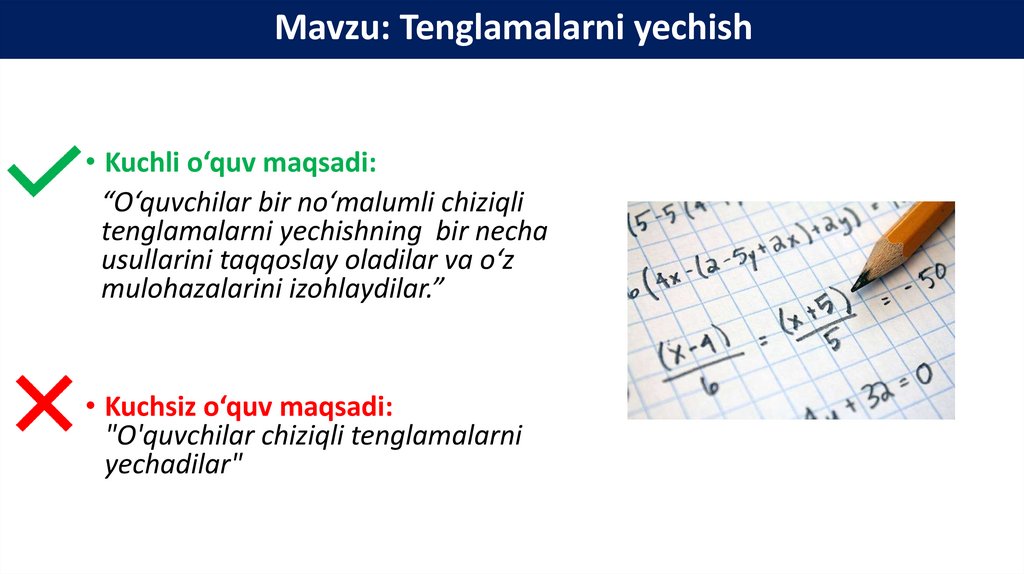 Mavzu: Tenglamalarni yechish• Kuchli o‘quv maqsadi:
