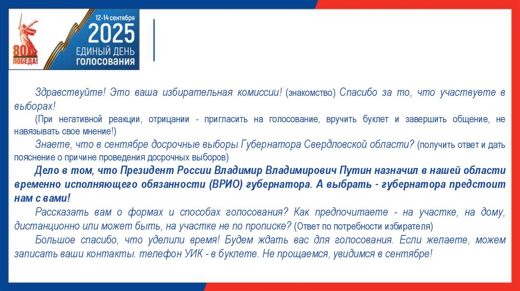(При негативной реакции, отрицании - пригласить на голосование, вручить буклет и завершить общение, не
