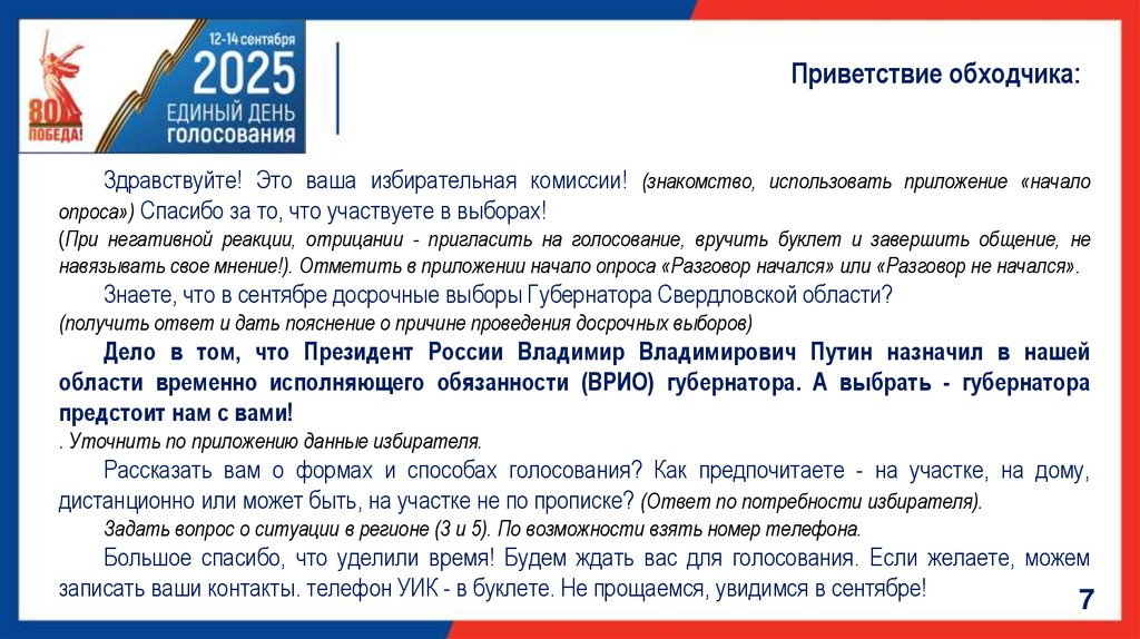 Приветствие обходчика:Здравствуйте! Это ваша избирательная комиссии! (знакомство, использовать приложение «начало