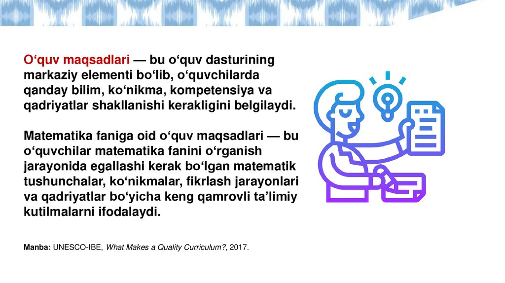 O‘quv maqsadlari — bu o‘quv dasturiningmarkaziy elementi bo‘lib, o‘quvchilarda