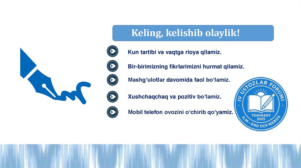 Keling, kelishib olaylik!Kun tartibi va vaqtga rioya qilamiz.
