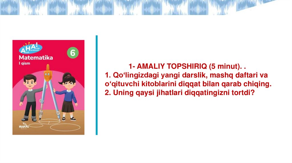 1- AMALIY TOPSHIRIQ (5 minut). .1. Qo‘lingizdagi yangi darslik, mashq daftari va