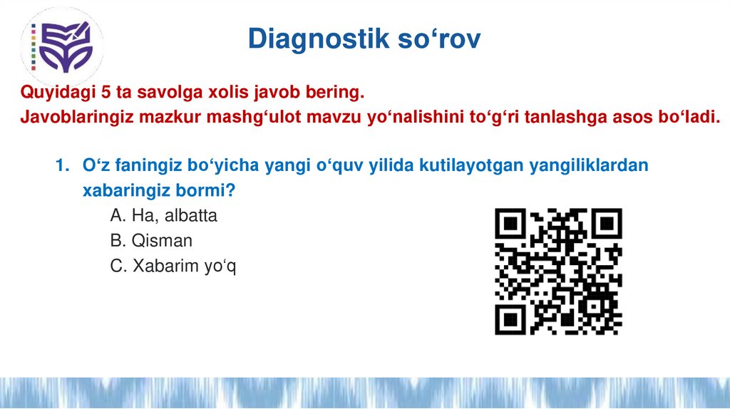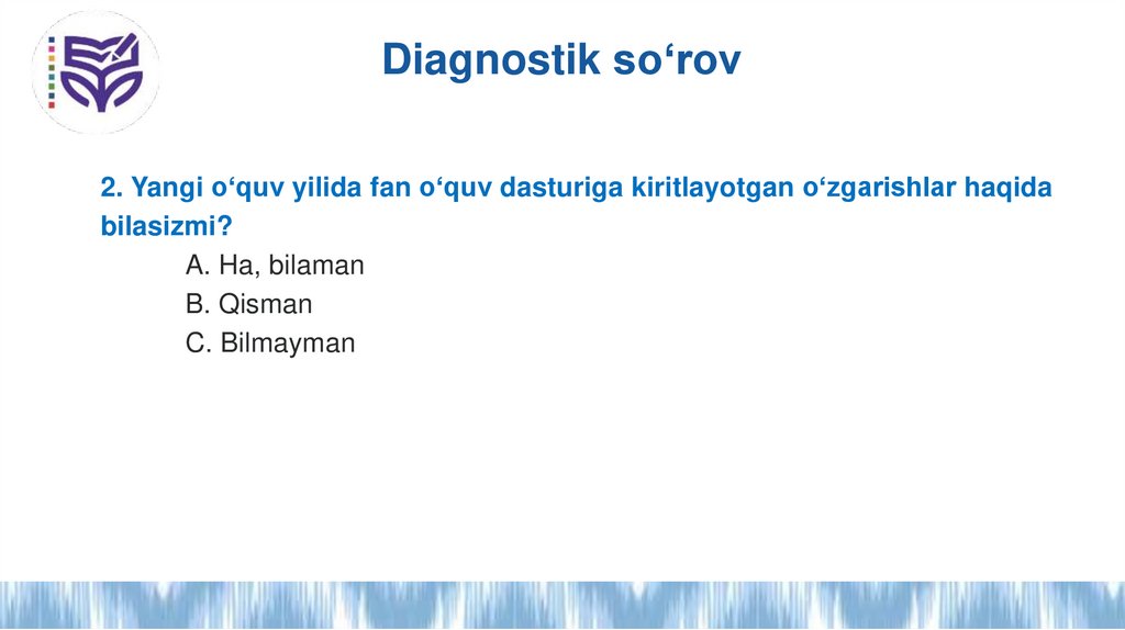 Diagnostik so‘rov2. Yangi o‘quv yilida fan o‘quv dasturiga kiritlayotgan o‘zgarishlar haqida