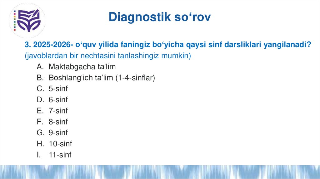 Diagnostik so‘rov3. 2025-2026- o‘quv yilida faningiz bo‘yicha qaysi sinf darsliklari yangilanadi?