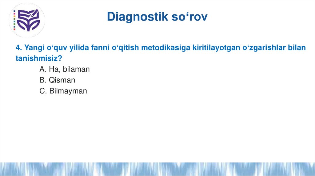 Diagnostik so‘rov4. Yangi o‘quv yilida fanni o‘qitish metodikasiga kiritilayotgan o‘zgarishlar bilan